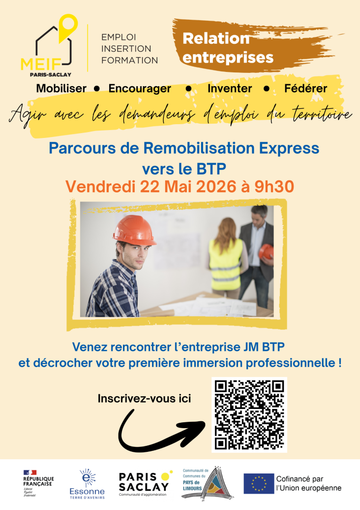 La MEIF Paris-Saclay en collaboration avec l'entreprise JM BTP vous propose un parcours de remobilisation vers les métiers du BTP.